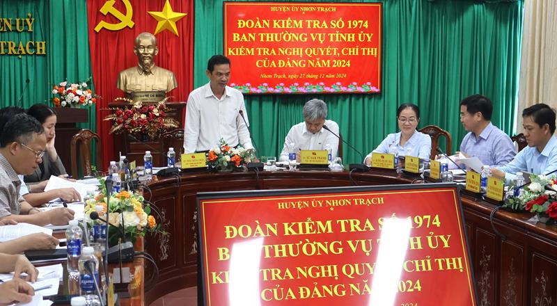 Báo cáo trước Đoàn kiểm tra, Phó Bí thư Thường trực Huyện uỷ, Chủ tịch HĐND huyện Dương Thị Mỹ Châu cho biết, huyện Nhơn Trạch đã thực hiện 57 chỉ tiêu, trong đó có 12 chỉ tiêu vượt và đạt 45 chỉ tiêu theo Nghị quyết số 11 của Tỉnh uỷ; trong thực hiện Nghị quyết số 09 của Huyện uỷ, địa phương đã phấn đấu thực hiện đạt và vượt 58/58 chỉ tiêu, nổi bật nhất là các chỉ tiêu thu ngân sách, tổng vốn huy động đầu tư phát triển, thu nhập bình quân đầu người, tỷ lệ phân loại rác thải sinh hoạt tại nguồn ở các hộ gia đình, đơn vị ; giảm tỷ lệ hộ nghèo; tỷ lệ hộ dân sử dụng nước sạch đạt chuẩn,…đều vượt cao so với chỉ tiêu đề ra. Bên cạnh đó, Đảng bộ huyện cũng đã tập trung thực hiện các Nghị quyết chuyên đề của Tỉnh uỷ như: Nghị quyết số 09 của Tỉnh uỷ về “phát triển đô thị Nhơn Trạch đến năm 2030, tầm nhìn đến năm 2040; Nghị quyết số 05 của Tỉnh uỷ về chuyển đổi số tỉnh Đồng Nai đến năm 2025 và định hướng đến năm 2030; Nghị quyết số 07 của Ban Chấp hành Đảng bộ tỉnh khoá XI về phát triển nhà ở công nhân, nhà ở xã hội, giai đoạn 2021 – 2025 trên địa bàn tỉnh;…