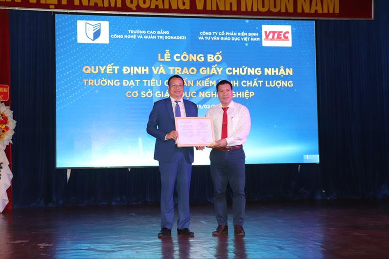 Tiến sĩ Nguyễn Mạnh Cường (bìa phải), Phó Giám đốc Công ty cổ phần Kiểm định và Tư vấn giáo dục Việt Nam VTEC trao chứng nhận đạt chuẩn kiểm định chất lượng cơ sở giáo dục nghề nghiệp cho đại diện Trường Cao đẳng Công nghệ và Quản trị Sonadezi