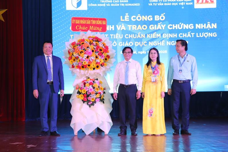 (CTT-Đồng Nai) - Sáng 15-2, Trường Cao đẳng Công nghệ và Quản trị Sonadezi (Trường Cao đẳng Sonadezi) đã long trọng tổ chức lễ công bố quyết định và trao giấy chứng nhận trường đạt tiêu chuẩn kiểm định chất lượng cơ sở giáo dục nghề nghiệp. Phó Chủ tịch UBND tỉnh Nguyễn Sơn Hùng đã đến dự và tặng lẵng hoa chúc mừng nhà trường.