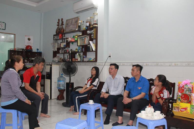 Anh Lê Anh Quân (áo xanh), Phó Chủ tịch Hội đồng Đội Trung ương và Phó Bí thư thường trực Tỉnh đoàn, Chủ tịch Hội đồng Đội tỉnh Võ Văn Trung thăm, động viên gia đình và cá nhân em Bùi Hoàng Oanh và Bùi Thanh Trúc
