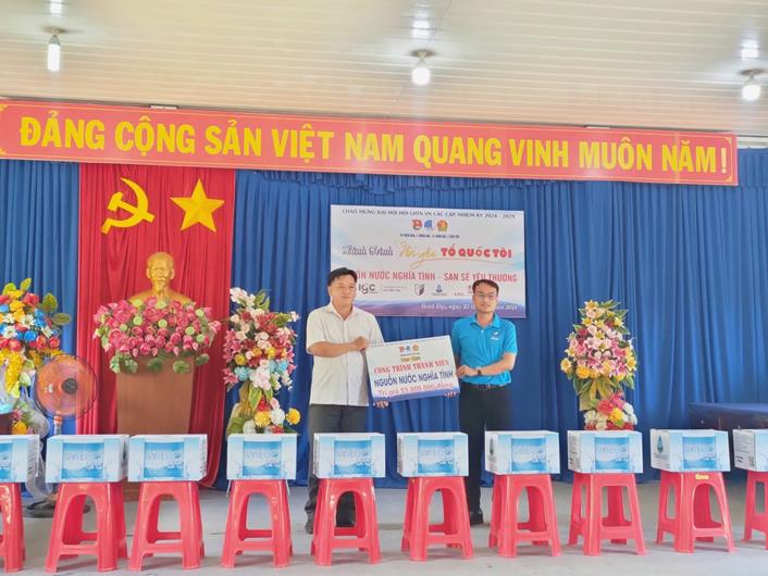 Đại diện Thành đoàn Biên Hòa trao bảng tượng trưng nguồn nước nghĩa tình cho đại diện địa phương
