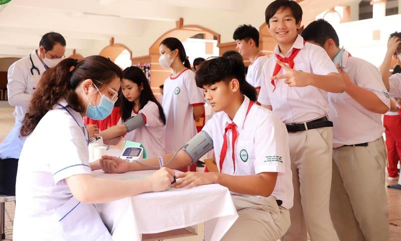 Học sinh được đo huyết áp kiểm tra sức khỏe
