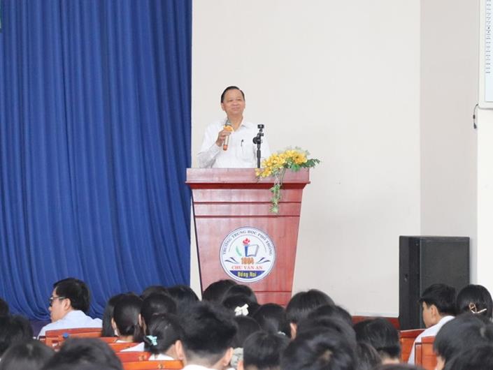 Ủy viên Ban Thường vụ Tỉnh ủy, Chủ nhiệm Ủy ban Kiểm tra Tỉnh ủy, Chủ tịch Hội hữu nghị Việt Nam – Hàn Quốc tỉnh Huỳnh Thanh Bình trao đổi về việc học tiếng Hàn với học sinh Trường Trung học phổ thông Chu Văn An