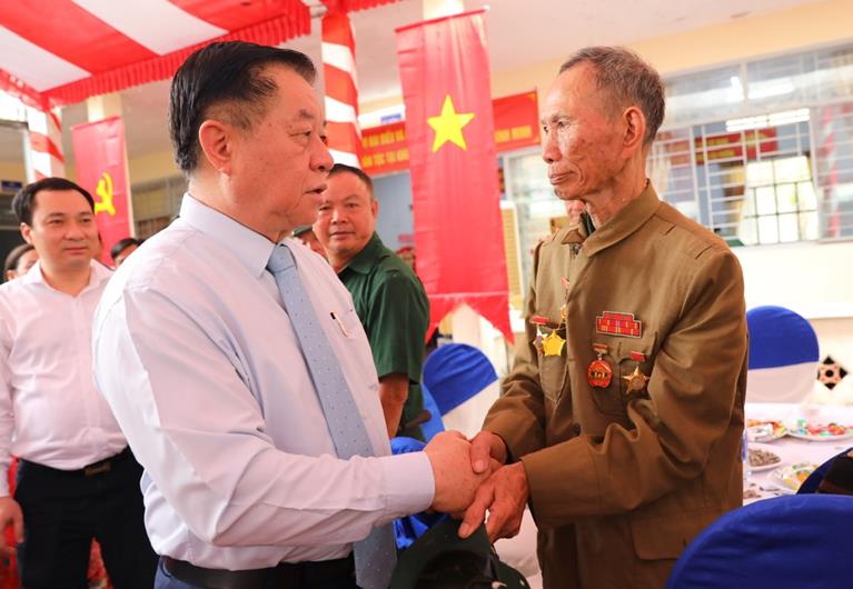 Trưởng Ban Tuyên giáo Trung ương Nguyễn Trọng Nghĩa trao đổi với cựu chiến binh tại Ngày hội Đại đoàn kết toàn dân tộc tại ấp Tân Bắc