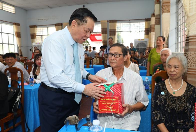 Trưởng Ban Tuyên giáo Trung ương Nguyễn Trọng Nghĩa tặng quà cho người dân tại Ngày hội Đại đoàn kết toàn dân tộc tại ấp Tân Bắc, xã Bình Minh, huyện Trảng Bom.