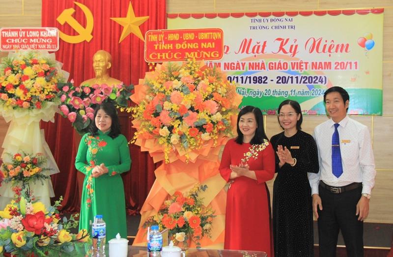 Phó Chủ tịch HĐND tỉnh Hoàng Thị Bích Hằng (bìa trái) tặng hoa của Tỉnh ủy – HĐND – UBND – Ủy ban MTTQ tỉnh chúc mừng Trường Chính trị tỉnh