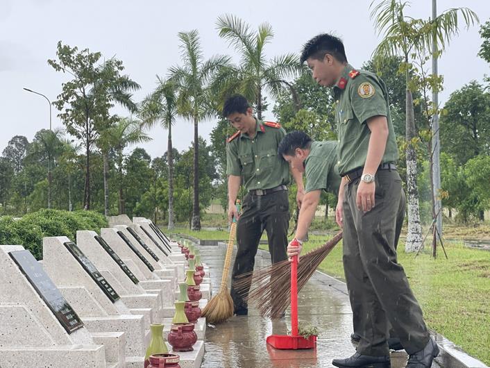 Đoàn viên thanh niên Công an tỉnh chăm sóc các phần mộ liệt sĩ tại Nghĩa trang liệt sĩ tỉnh