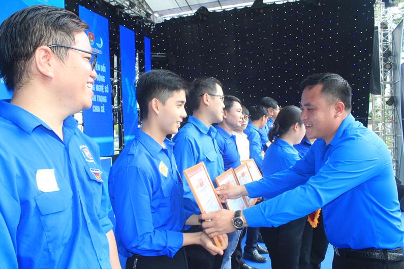 Phó Bí thư Tỉnh đoàn, Chủ tịch Hội LHTN tỉnh Nguyễn Hiếu Trung trao bằng khen cho các tập thể điển hình trong phong trào Tuổi trẻ sáng tạo