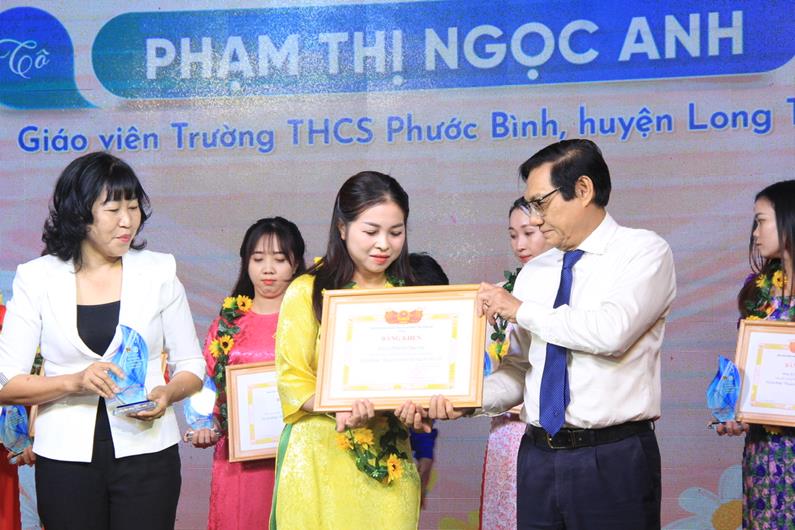 Phó Chủ tịch UBND tỉnh Nguyễn Sơn Hùng (bìa phải) trao bằng khen của Tỉnh đoàn cho các cá nhân đoạt giải thưởng Nhà giáo trẻ tiêu biểu tỉnh Đồng Nai năm 2024