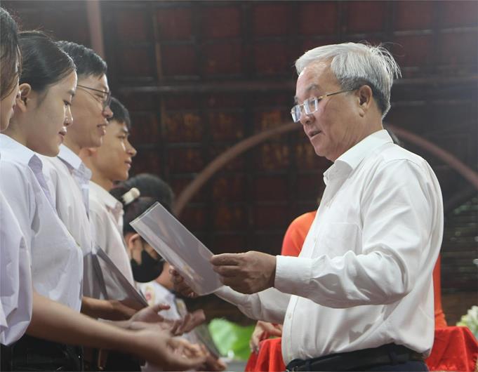 Ủy viên Ban Thường vụ Tỉnh ủy, Chủ tịch Ủy ban MTTQ Việt Nam tỉnh Cao Văn Quang trao học bổng Nguyễn Văn Ký cho các em học sinh, sinh viên.