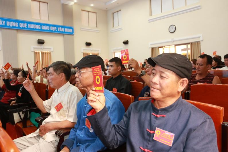 Đại biểu tham dự Đại hội đại biểu các dân tộc thiểu số DTTS thành phố Long Khánh lần thứ IV-2024 thể hiện quyền biểu quyết về nội dung đại hội