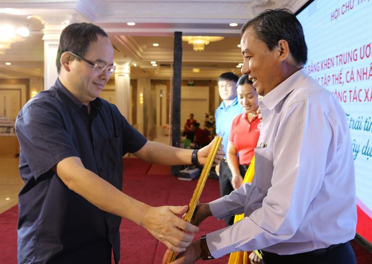 Phó Bí thư Tỉnh ủy, Trưởng Đoàn đại biểu Quốc hội tỉnh Quản Minh Cường trao bằng khen của UBND tỉnh cho tập thể, cá nhân có đóng góp tích cực trong công tác nhân đạo năm 2022