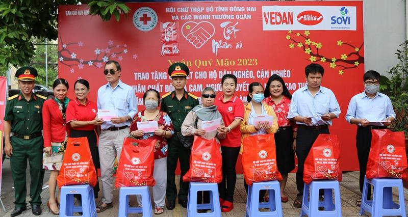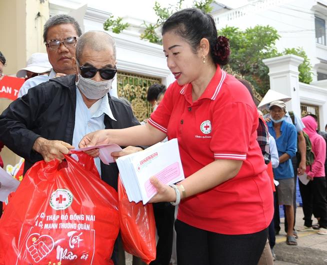 Người khiếm thị tại TP.Biên Hòa nhận quà tết do Hội Chữ thập đỏ tỉnh trao tặng.