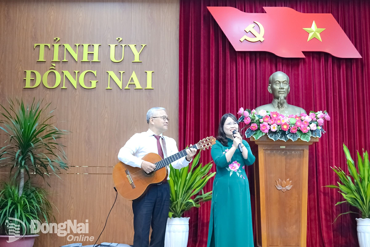 | Giảng viên chính Khoa Xây dựng Đảng, Học viện Cán bộ Thành phố Hồ Chí Minh Hà Trung Thành giao lưu văn nghệ với cán bộ Ban Tuyên giáo và Dân vận Tỉnh ủy Đồng Nai tại hội nghị. Ảnh: Phương Hằng |