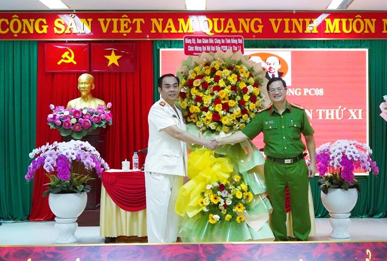 Đồng chí Đại tá Trần Anh Sơn, Ủy viên Ban Thường vụ Đảng ủy, Phó Giám đốc Công an tỉnh thay mặt Đảng ủy, Ban Giám đốc Công an tỉnh tặng hoa chúc mừng Đại hội và chụp hình lưu niệm với Ban lãnh đạo Phòng Cảnh sát giao thông