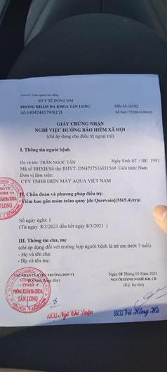 Một giấy nghỉ ốm hưởng BHXH do Phòng Khám đa khoa Tân Long, TP.Biên Hòa cấp được đăng tải trên mạng xã hội