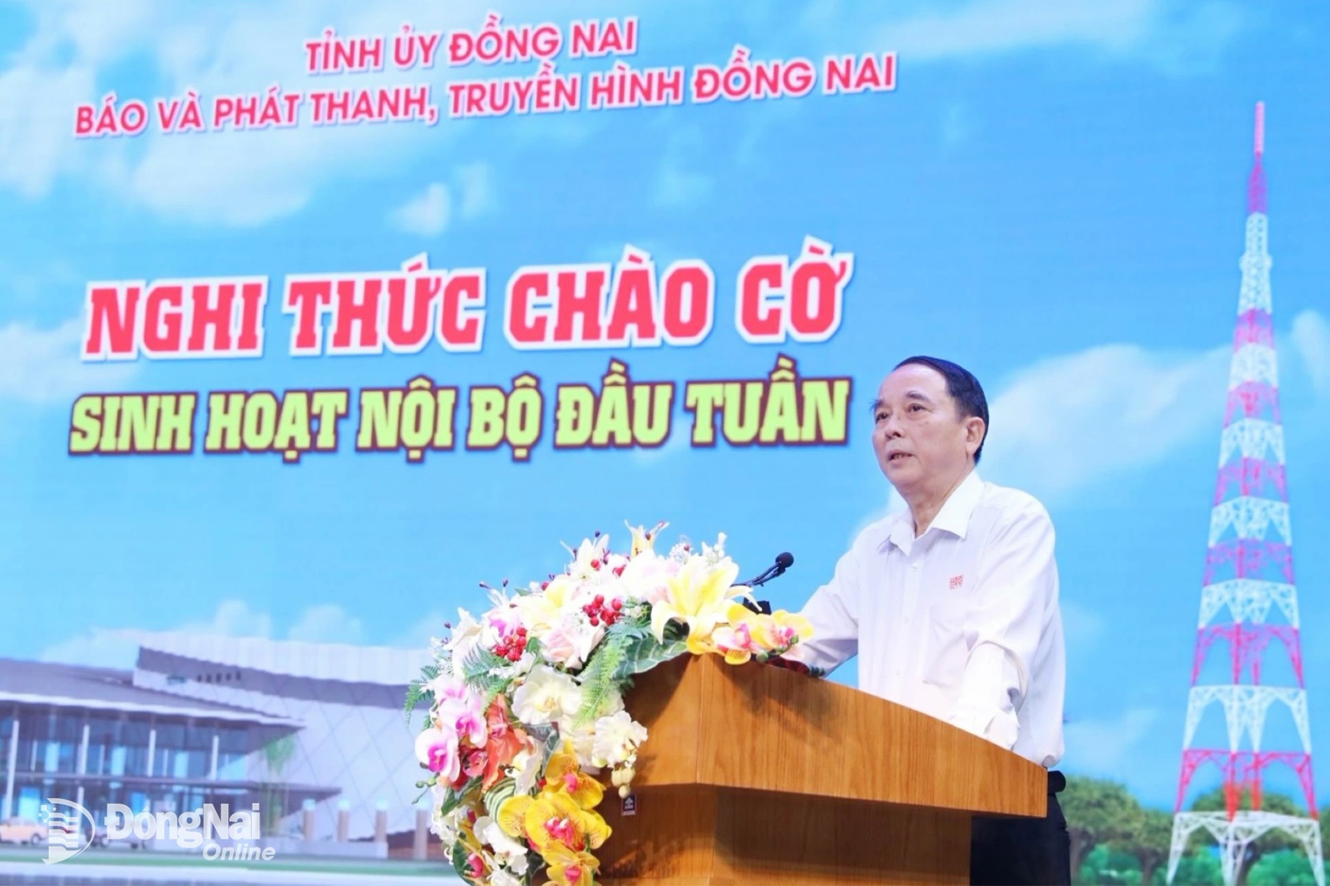 Phó Bí thư Đảng ủy, Phó Giám đốc phụ trách Báo và Phát thanh, Truyền hình Đồng Nai Cao Quốc Sang phát biểu trong buổi chào cờ và học tập nghị quyết. Ảnh: Huy Anh