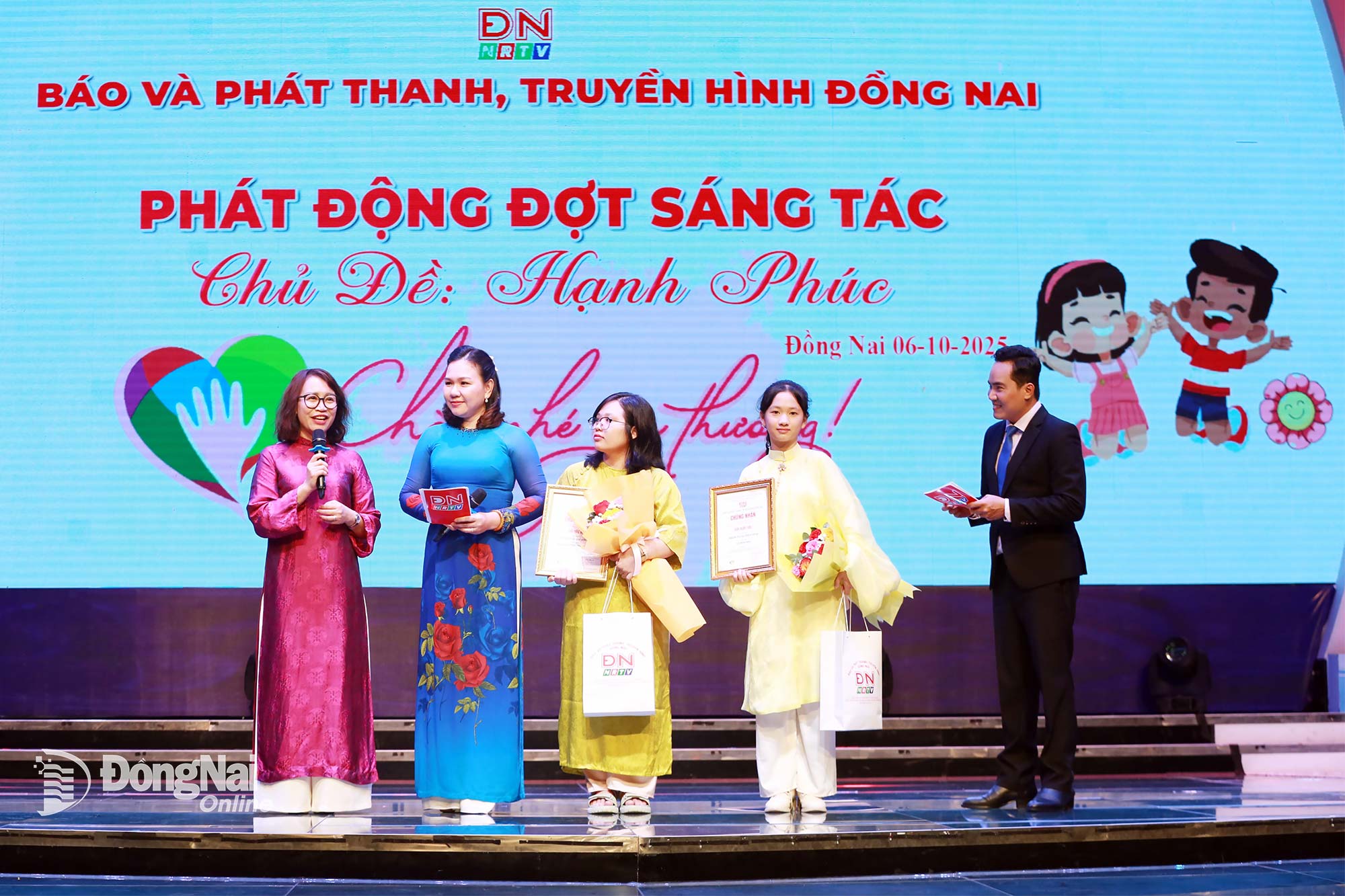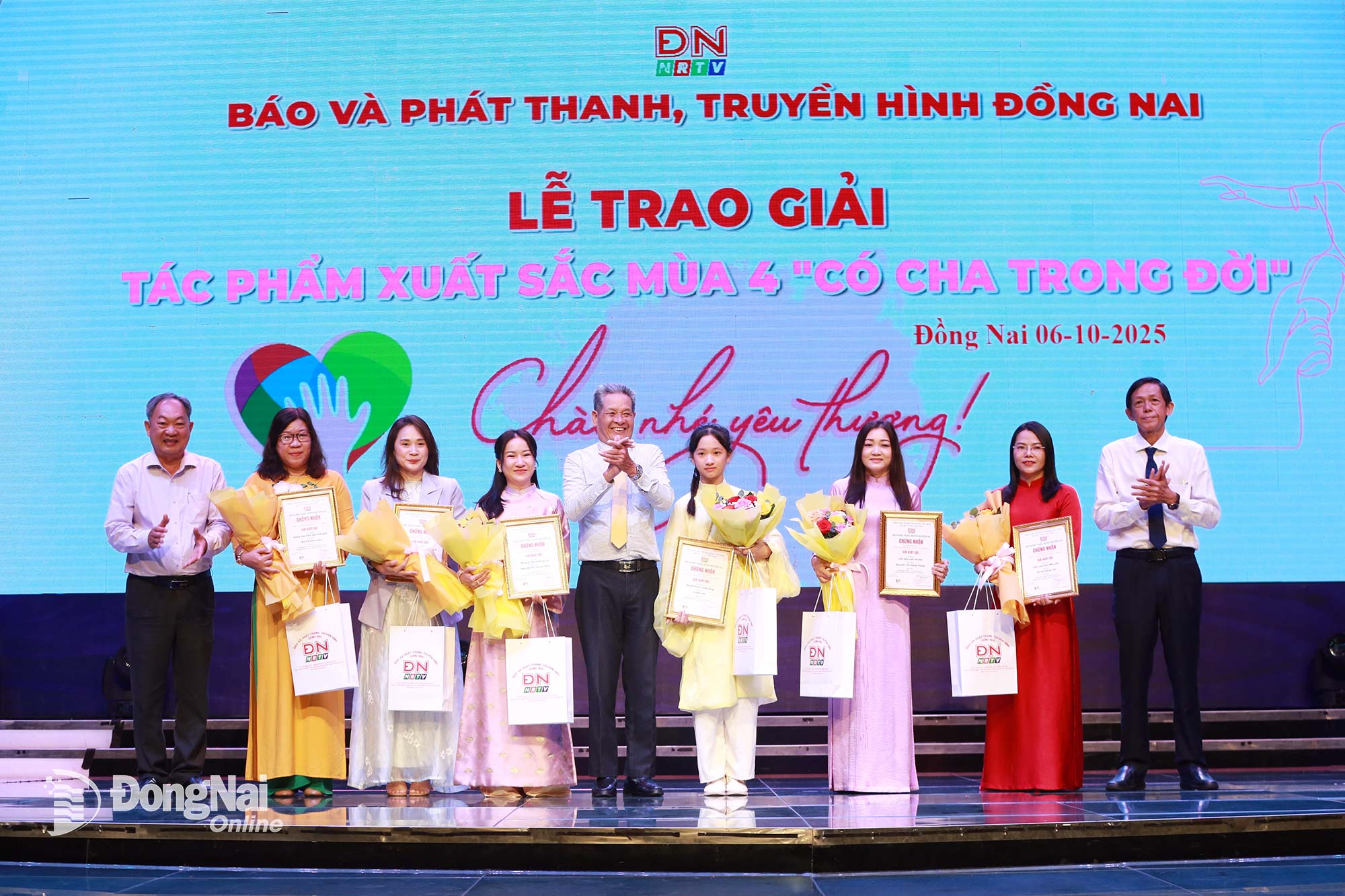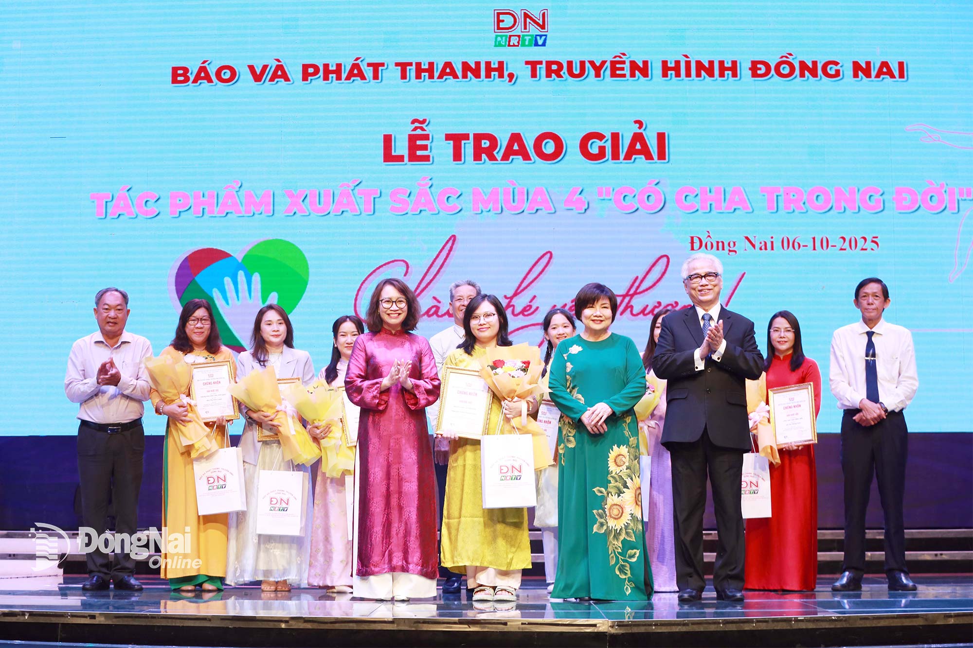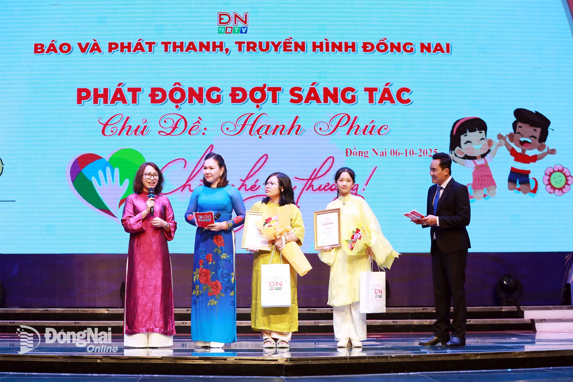 Tỉnh ủy viên, Tổng Biên tập Báo và Phát thanh, Truyền hình Đồng Nai Nguyễn Thị Minh Nhâm cùng GS.TS Nguyễn Khắc Thuần, TS Lý Thị Mai trao giấy chứng nhận cho tác giả đoạt giải Đặc biệt viết về Cha. Ảnh: Huy Anh