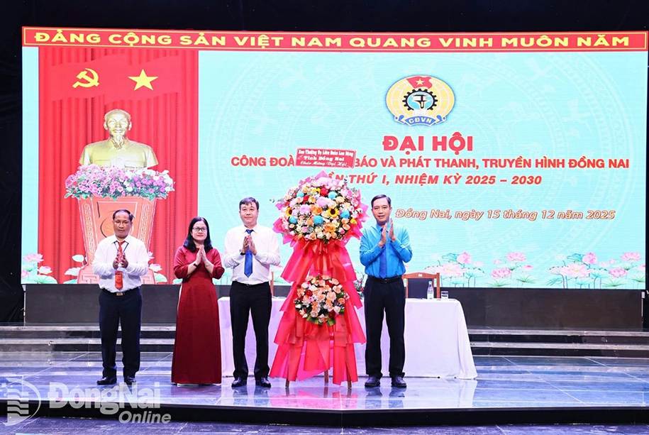 Đại diện Liên đoàn Lao động tỉnh và Ban Biên tập Báo và Phát thanh, Truyền hình Đồng Nai chúc mừng Ban Chấp hành Công đoàn cơ sở nhiệm kỳ 2025-2030. Ảnh: Công Nghĩa