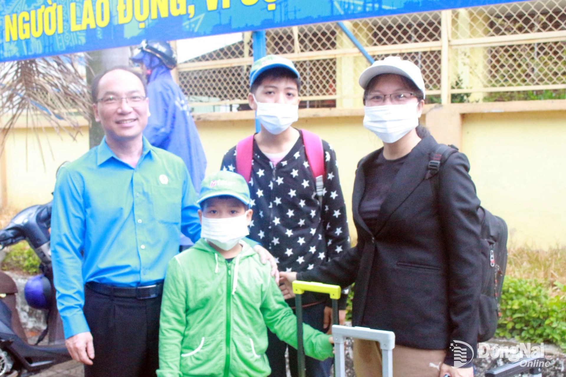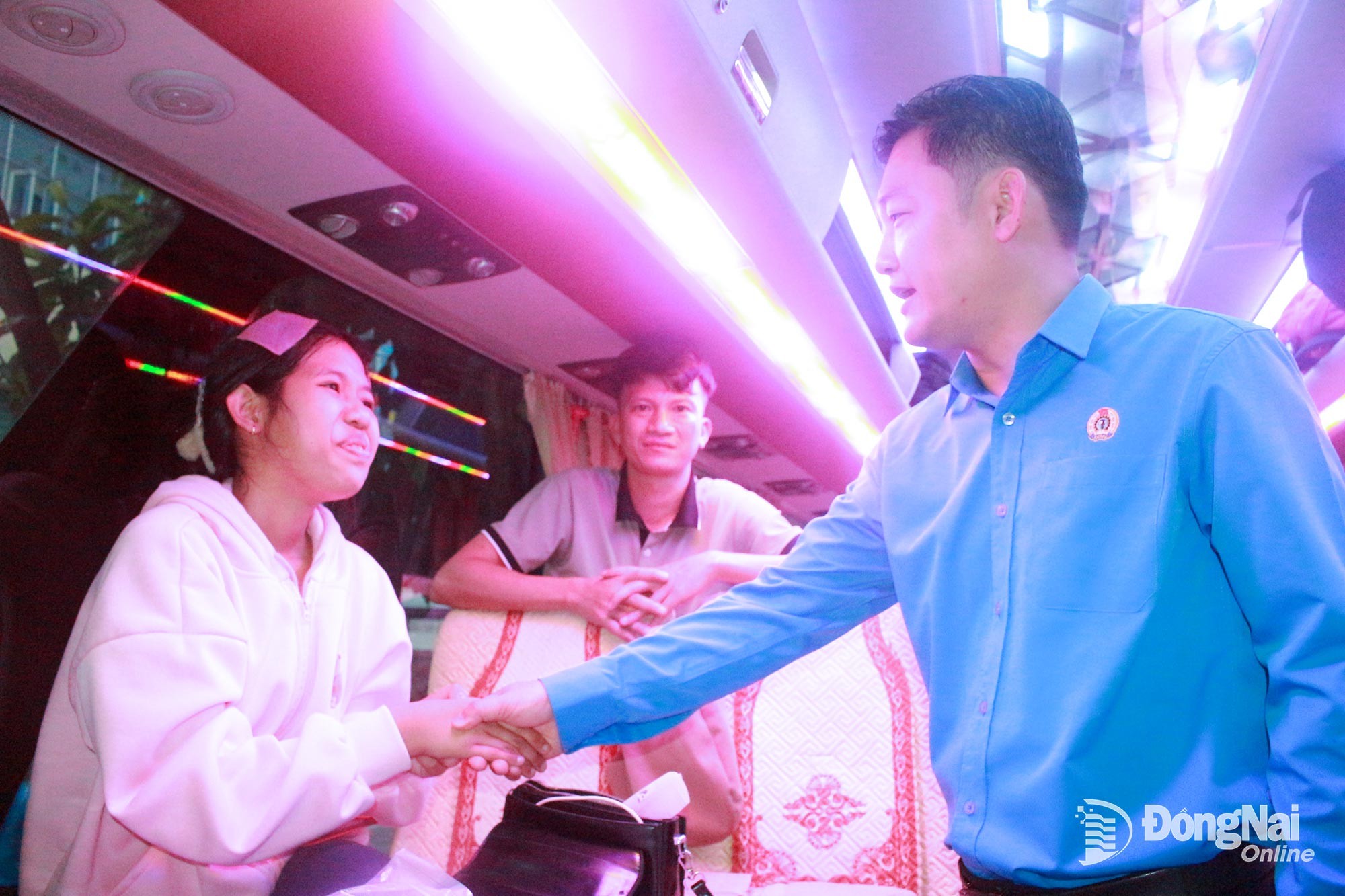 Ủy viên Ban Thường vụ Tỉnh ủy, Phó Chủ tịch Thường trực Ủy ban MTTQ Việt Nam tỉnh Đồng Nai Hà Anh Dũng và Tỉnh ủy viên, Phó Chủ tịch Ủy ban MTTQ Việt Nam tỉnh, Chủ tịch Liên đoàn Lao động tỉnh Đồng Nai Nguyễn Quốc Dũng thăm hỏi, lì xì công nhân trước khi xe xuất phát. Ảnh: N.Hòa