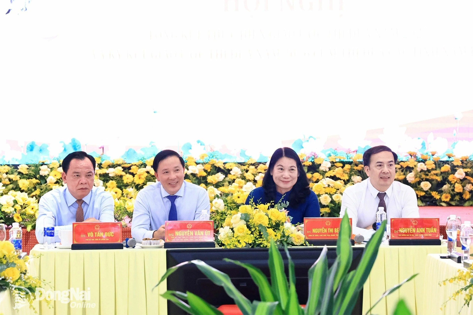 Chủ trì hội nghị có các đồng chí: Nguyễn Anh Tuấn, Phó Trưởng ban Thi đua - Khen thưởng (TĐKT) Trung ương; Võ Tấn Đức, Phó Bí thư Tỉnh ủy, đại diện lãnh đạo Tỉnh ủy Đồng Nai; Nguyễn Văn Út, Phó Bí thư Tỉnh ủy, Chủ tịch UBND tỉnh Đồng Nai, Chủ tịch Hội đồng TĐKT tỉnh Đồng Nai; Nguyễn Thị Bé Mười, Tỉnh ủy viên, Phó Chủ tịch UBND tỉnh Vĩnh Long, Cụm phó Cụm Thi đua các tỉnh Nam Bộ năm 2025.