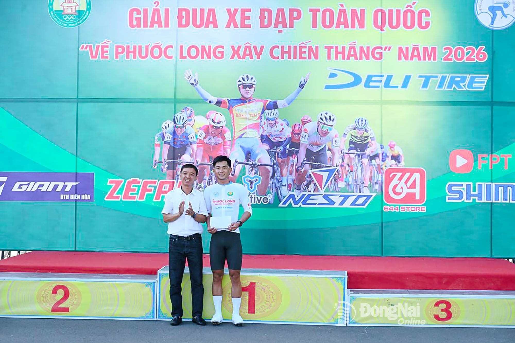 Ban tổ chức trao giải cho các VĐV đạt thành tích cao trong chặng 1. Ảnh: Như Nam