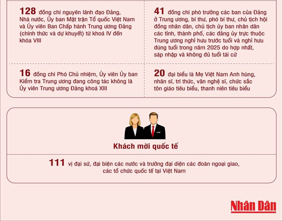 Dự Đại hội đại biểu toàn quốc lần thứ XIV của Đảng Cộng sản Việt Nam có 1.586 đại biểu thay mặt cho hơn 5,6 triệu đảng viên toàn Đảng. Trong đó, đại biểu đương nhiên là 163 đồng chí, đại biểu được bầu là 353 đồng chí, đại biểu được chỉ định là 1.070 đồng chí.