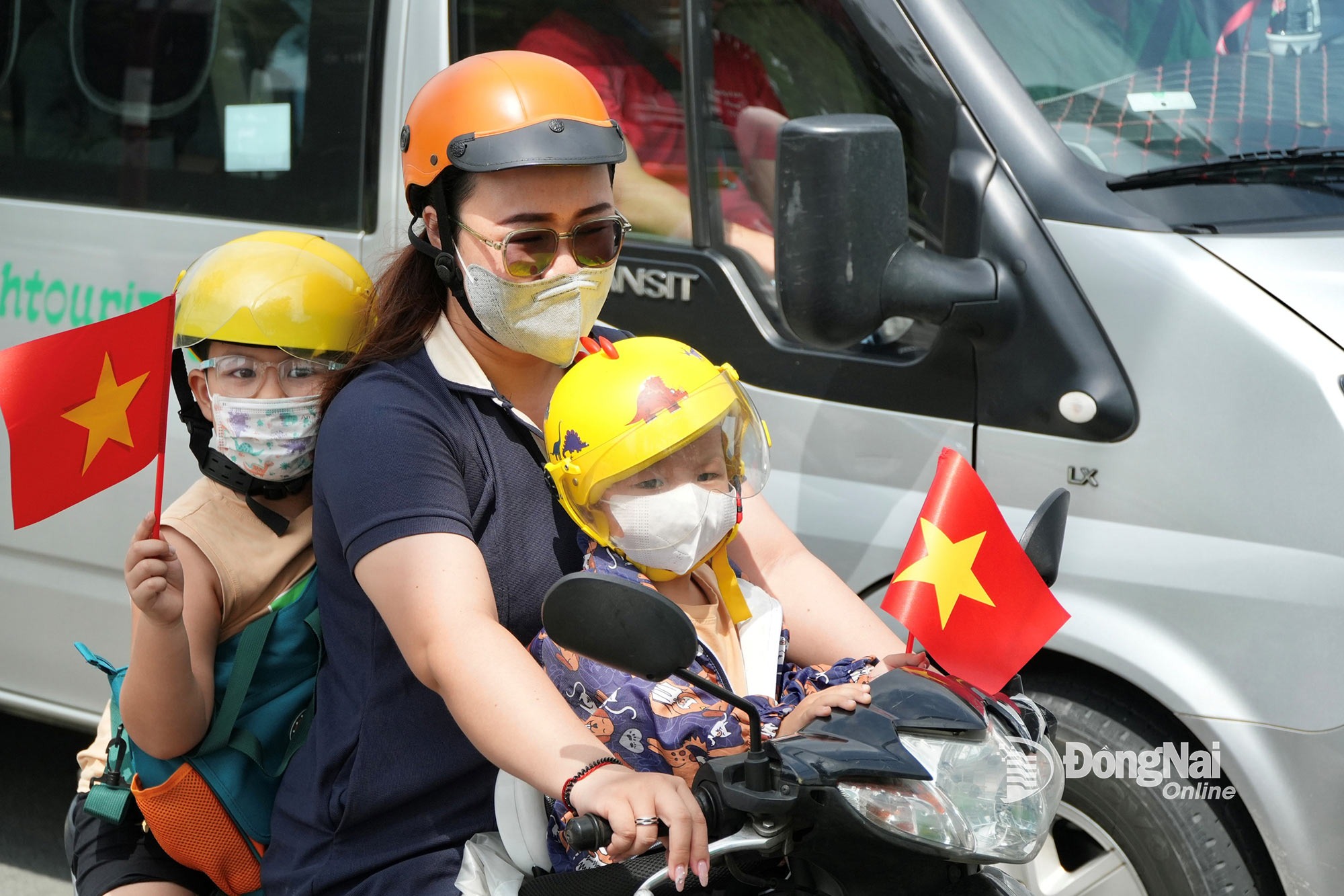 Các em nhỏ được phụ huynh chở đi trên đường với lá cờ đỏ sao vàng vừa được cán bộ, chiến sĩ cảnh sát giao thông tặng. Ảnh: Đăng Tùng