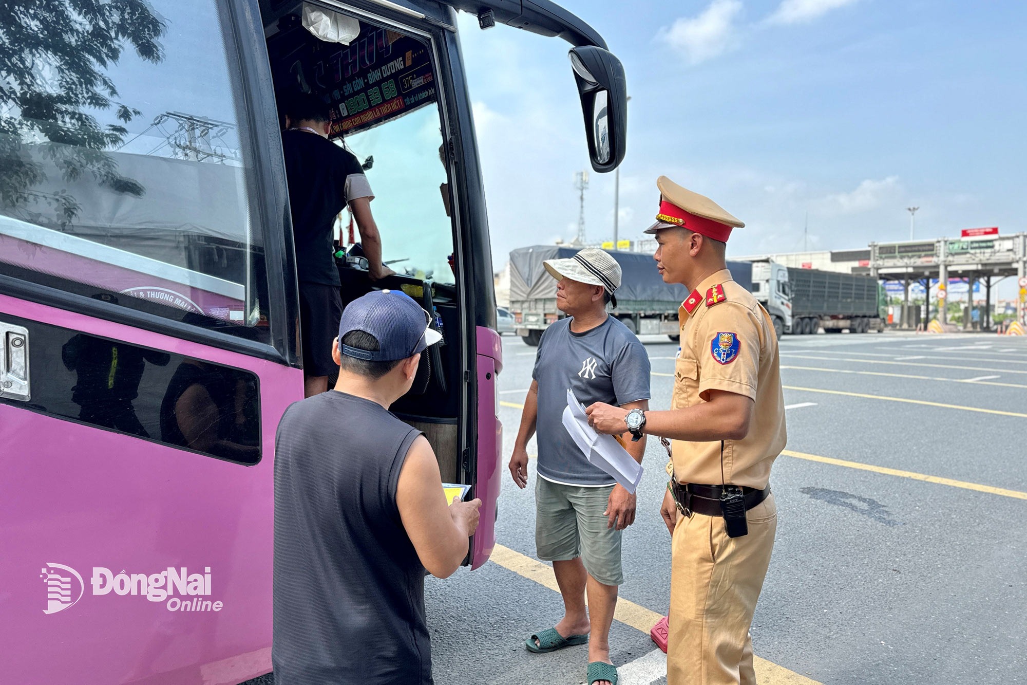 Cán bộ, chiến sĩ Phòng Cảnh sát giao thông, Công an tỉnh Đồng Nai kiểm tra xe khách lưu thông trên quốc lộ 1 hướng về cầu Đồng Nai (phường Trấn Biên, tỉnh Đồng Nai). Ảnh: Đăng Tùng