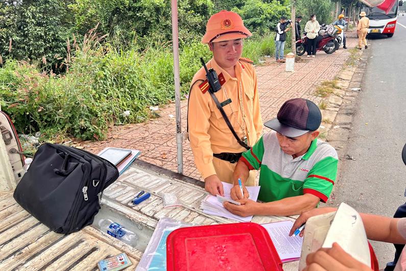 Trạm Cảnh sát giao thông Suối Tre (Phòng Cảnh sát giao thông Công an tỉnh) yêu cầu các chủ xe, tài xế điều khiển phương tiện lưu thông trên tuyến quốc lộ 1 ký cam kết tuân thủ quy định giao thông đường bộ. Ảnh: CTV