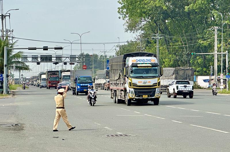 Đội Cảnh sát giao thông số 1 (Phòng Cảnh sát giao thông Công an tỉnh) kiểm soát các phương tiện lưu thông trên đường Võ Nguyên Giáp đoạn qua TP.Biên Hòa. Ảnh: Trúc Viên.