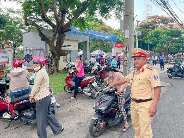 Lực lượng Cảnh sát giao thông điều tiết, bảo đảm trật tự an toàn giao thông tại điểm thi Trường THPT Trấn Biên (TP. Biên Hòa)