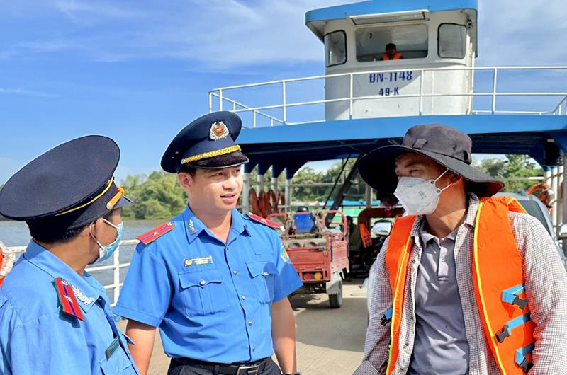 Đội Thanh tra giao thông số 5 (Thanh tra giao thông, Sở GT-VT) nhắc nhở quản lý bến bãi, hành khách nghiêm túc thực hiện các biện pháp an toàn tại bến phà Bà Miêu (H.Vĩnh Cửu). Ảnh: Trúc Viên