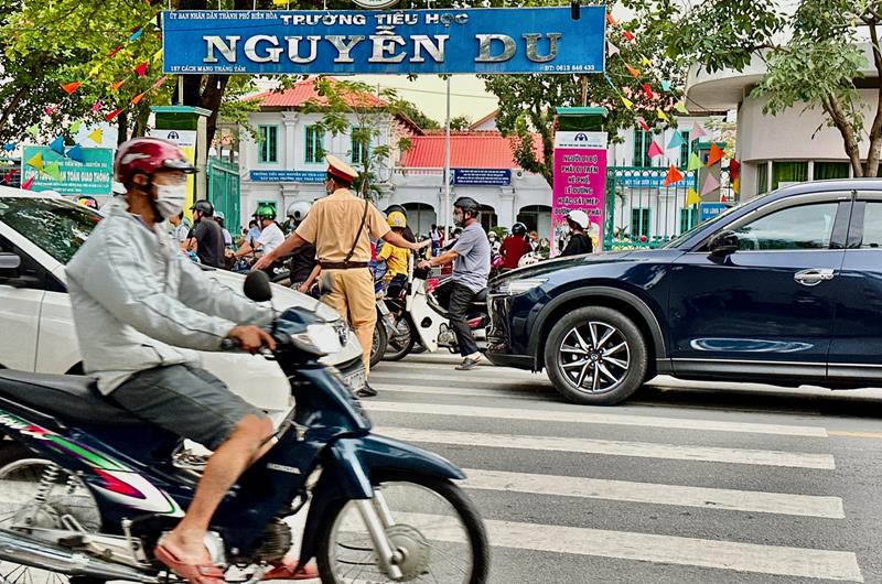 Đội Cảnh sát giao thông - trật tự Công an TP.Biên Hòa thường xuyên có mặt điều tiết giao thông trước cổng Trường tiểu học Nguyễn Du - địa điểm được Ban An toàn giao thông tỉnh nhận định thường xảy ra ùn tắc giao thông cục bộ vào giờ cao điểm. Ảnh: Trúc Viên