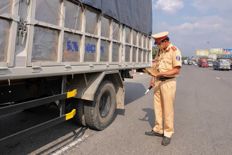 Lực lượng cảnh sát giao thông kiểm soát tài xế xe tải, xe đầu kéo di chuyển trên quốc lộ 1, đoạn qua thành phố Biên Hòa