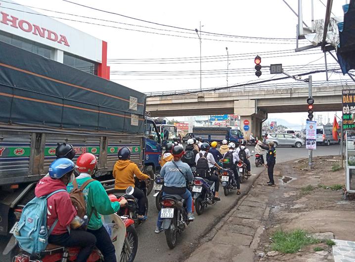 Các thành viên trong Tổ tự quản an toàn giao thông trật tự thị trấn Dầu Giây (huyện Thống Nhất) tham gia phân luồng giao thông hỗ trợ người đi đường tại ngã ba, ngã tư các trục đường chính tại Quốc lộ 1, Quốc lộ 20
