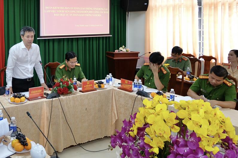 (CTT-Đồng Nai) - Ngày 12-6, Đoàn công tác của UBND tỉnh do Phó trưởng ban thường trực Ban An toàn giao thông (ATGT) tỉnh, Giám đốc Sở Giao thông vận tải Lê Quang Bình dẫn đầu đã kiểm tra công tác bảo đảm trật tự ATGT 5 tháng đầu năm 2024 tại huyện Long Thành.
