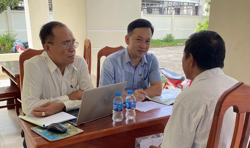 Các luật gia Hội Luật gia tỉnh (bên trong) tư vấn về tranh chấp đất đai cho người dân tại buổi tuyên truyền pháp luật ở xã Mã Đà (huyện Vĩnh Cửu). Ảnh: Nhân Thái.