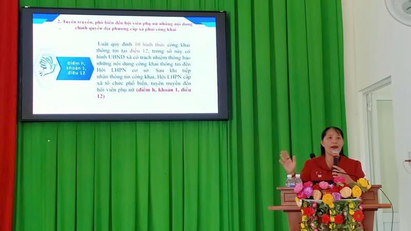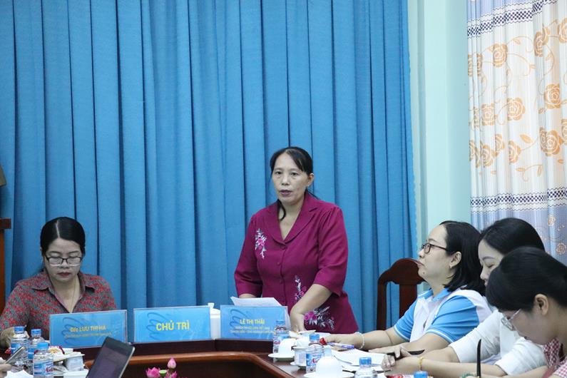 Bà Lê Thị Thái tại hội nghị tập huấn năm 2024 về “Giới thiệu Luật thực hiện dân chủ ở cơ sở và trách nhiệm của Hội Liên hiệp phụ nữ trong thực hiện dân chủ ở cơ sở” cho hội viên phụ nữ huyện Định Quán