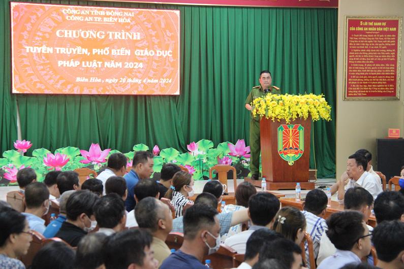 Cán bộ Công an thành phố Biên Hòa tuyên truyền pháp luật cho người dân trên địa bàn thành phố.