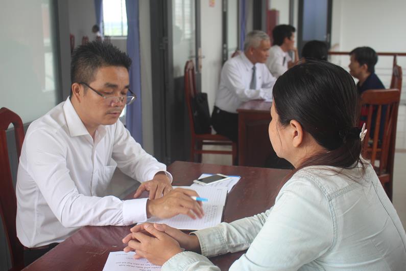 Luật sư Trần Văn Giáp (tay trái, Đoàn Luật sư tỉnh) tư vấn cho người dân xã La Ngà (H.Định Quán) về tranh chấp dân sự tại buổi tuyên truyền do Đoàn Luật sư tỉnh phối hợp với địa phương tổ chức