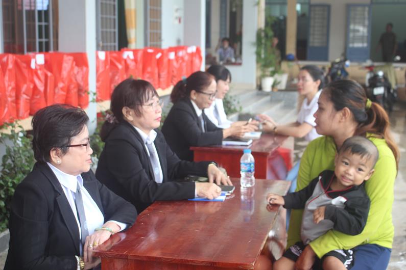 Các luật sư Đoàn luật sư tỉnh (tay trái) tư vấn pháp luật cho người dân xã La Ngà (H.Định Quán) tại buổi tuyên truyền