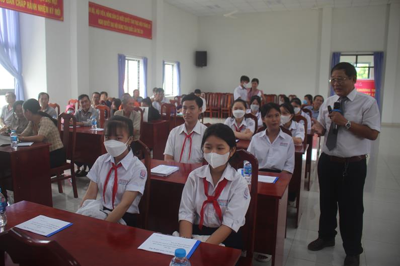 Luật sư Nguyễn Đức (Hội Luật gia tỉnh) nói chuyện về bạo lực gia đình cho học sinh Trường THCS Nguyễn Trãi (xã Phú Cường, H.Định Quán)