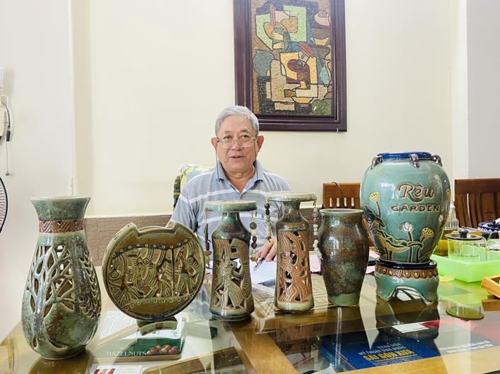 Nhà giáo Đinh Công Lai, Nguyên Trưởng Khoa Gốm, Trường Cao đẳng Mỹ thuật trang trí Đồng Nai bên các tác phẩm gốm truyền thống do chính ông chế tác