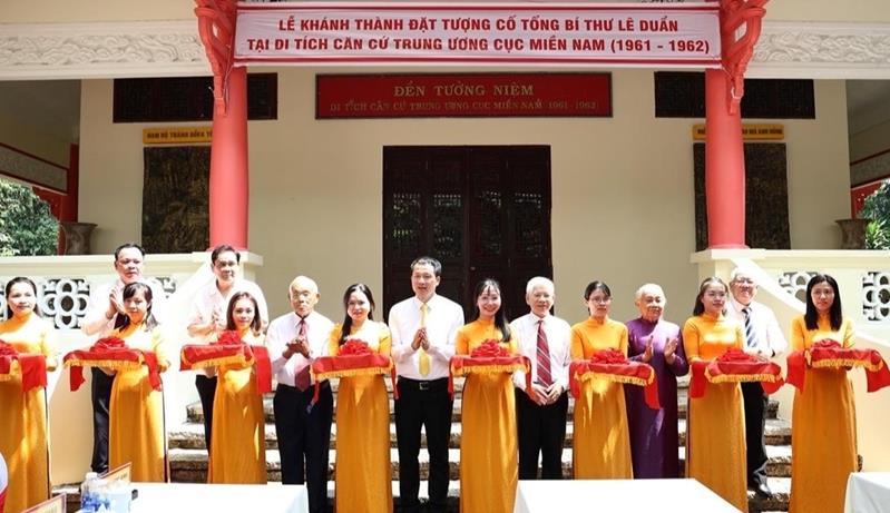 Các đại biểu cắt băng khánh thành đặt tượng cố Tổng Bí thư Lê Duẩn tại Đền tưởng niệm Di tích Căn cứ Trung ương Cục miền Nam