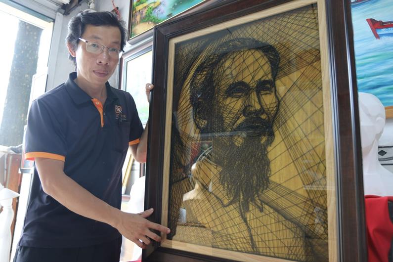 Theo đó, để làm nên sản phẩm này, ông sử dụng đinh đóng trên ván theo hình khối để tạo khung. Tiếp đó, ông sử dụng chỉ từ cuộn duy nhất để “đắp” đường nét. Bên cạnh nguyên liệu, nguyên tắc sáng tối trong sáng tác tranh được ông tận dụng để tạo hiệu ứng cho tác phẩm. “Nhìn bức tranh rất đơn giản, song để hoàn thành cần nhiều thời gian và làm đi làm lại rất nhiều lần mới hoàn chỉnh” - ông Quốc Trọng chia sẻ.