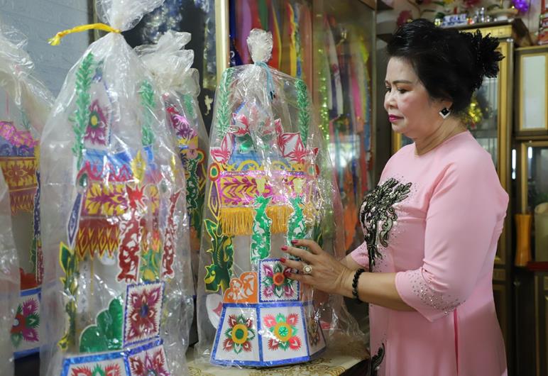 Nghệ nhân dân gian Đinh Thị Thanh Loan đang sắp xếp lại các mâm vàng, bạc chuẩn bị đi thực hành bóng rỗi - địa nàng tại các đình