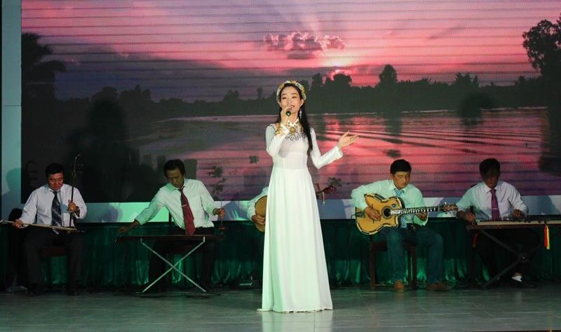 Chị Khánh Đan biểu diễn đờn ca tài tử, phục vụ nhân dân trên địa bàn huyện Tân Phú