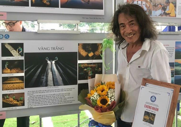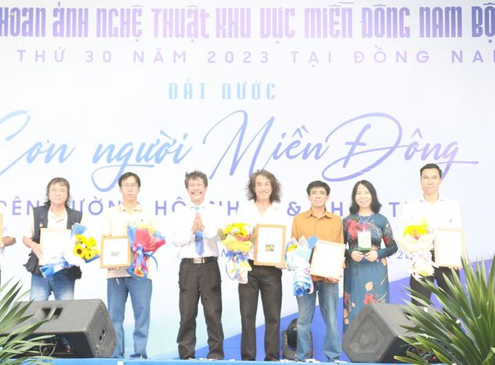 Nghệ sĩ nhiếp ảnh Lò Văn Hợp (giữa) nhận giải khuyến khích Liên hoan ảnh nghệ thuật khu vực miền Đông Nam bộ lần thứ 30 năm 2023 với bộ ảnh (8 tấm) Vàng trắng.