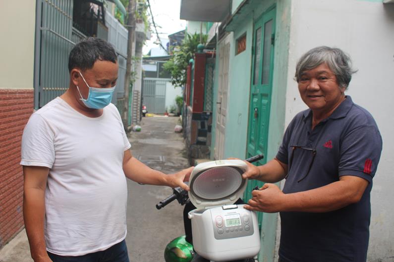 Nồi cơm điện được khách (tay trái) mang tới giao cho người thợ Bảy Tùng sửa